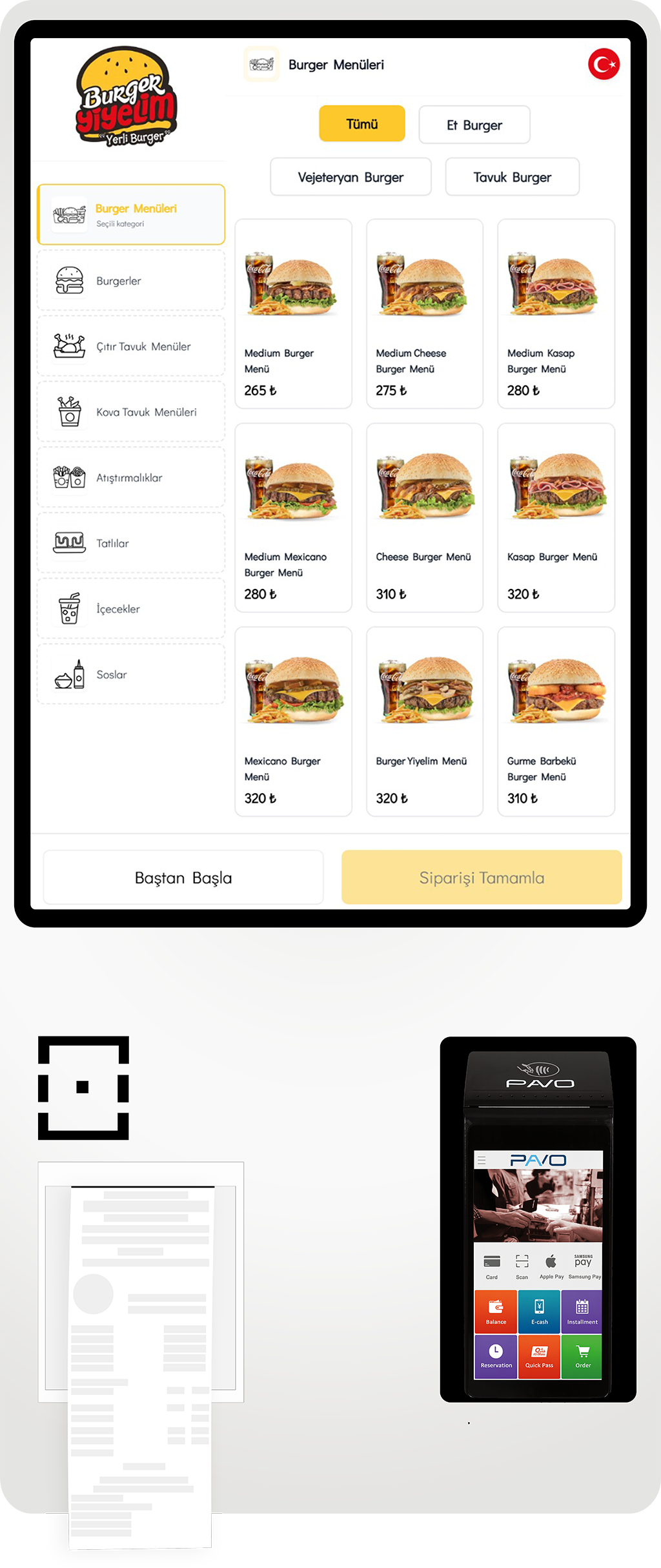 Müşterileriniz ister kiosk üzerinden, ister Getir, Trendyol veya Migros Yemek gibi popüler online platformlardan sipariş versin, tüm siparişler tek bir sistemde toplanır. Bu sayede farklı kanallardan gelen siparişleri ayrı ayrı yönetme zahmeti ortadan kalkar. Ayrıca Modpos, Adisyo, Pavo gibi POS sistemleri ve ödeme çözümleriyle tam uyumlu entegrasyon sunuyoruz.